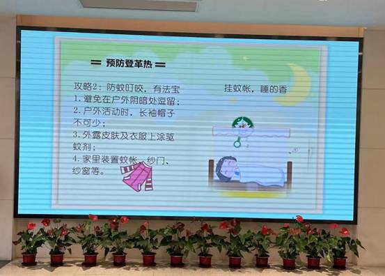 三是加大教育宣傳,共護(hù)健康家園。公司從7月底開始在大堂宣傳屏幕循環(huán)播放“兩熱”的傳播方式、癥狀識(shí)別、預(yù)防措施等視頻,在飯?zhí)妹黠@部位張貼“兩熱”知識(shí)科普宣傳畫報(bào),為工勤人員配備驅(qū)蚊水,并對噴灑施藥操作人員開展培訓(xùn),多渠道、多角度營造群防群控的大環(huán)境,提升科學(xué)防控水平。