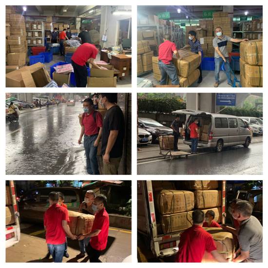 6月2日下午4時50分,利工民收到荔灣區白鶴洞街道緊急采購1000床毛巾被以協助解決抗疫工作人員休息難題的信息后,馬上組織十幾名員工進行備貨,不到一小時就將貨品集結并打包完畢。5時30分,朱佛令經理帶領五名員工冒著傾盆大雨,將貨物火速發往指定地點。