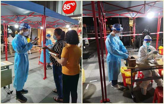 由于陳炯龍、陳英東兩位此前都有過負責核酸檢測掃碼工作的經驗,在志愿服務崗前培訓會議上,他們主動提出要承接這項亟需專注力和耐心的工作。陳炯龍為老人家仔細核對姓名、身份證號,耐心解釋工作流程,獲得老人一致好評。當醫護組上缺少志愿者時,陳英東又化身為核酸檢測樣管“護送人”,認真核對核酸樣管數量及檢測人數,及時準確地報送給醫護組……他們像陀螺一樣從晚上8點開始連軸轉忙碌到半夜12點多才結束任務回家。