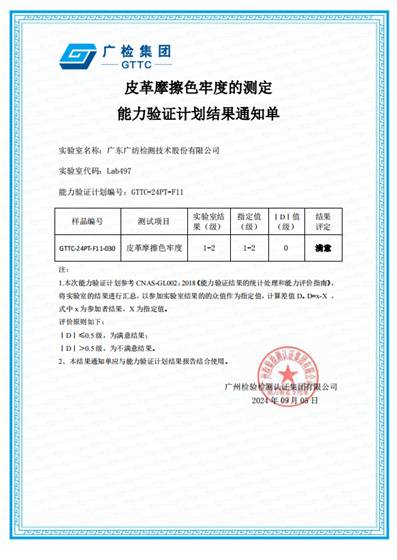 近日,廣東廣紡檢測技術股份有限公司收到廣州檢驗檢測認證集團有限公司組織的GTTC-24PT-F11皮革摩擦色牢度的測定能力驗證結果滿意通知單。